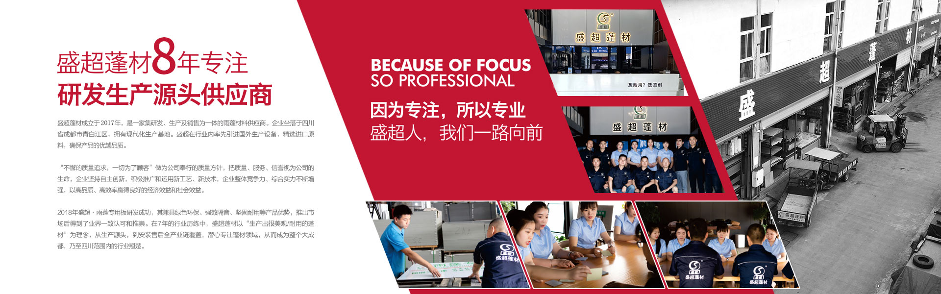 盛超蓬材是由四川超諾商貿有限公司創辦,是一家集研發、生產、銷售和服務于一體的專業雨蓬供應商。主要產品:實心耐力板,中空陽光板、多層板、蜂窩板、鋁瓦、消聲鋁瓦、不銹鋼消聲等材料的雨蓬產品。自主研發多款雨蓬,擁有自己的專利和檢測報告。其中明星產品新型組裝式雨蓬,擁有組裝簡便,美觀耐用、抗噪音,性價比高等優勢,多項檢測指標領跑同行業。受到了市場和經銷商的高度認可。 公司自成立至今,從銷售到研發再到生產,已經過了3次跨越式的發展。2017年已成為四川雨蓬行業內庫房面積大,員工多的一家公司。產值每年以平均20%的速度快速增長??梢哉f客戶是我們的老師,和他們合作使我們得到很多的學習機會來提高自身的技術水平和管理水平,是我們生產和發展的動力。